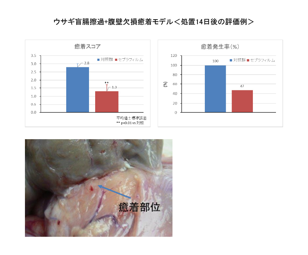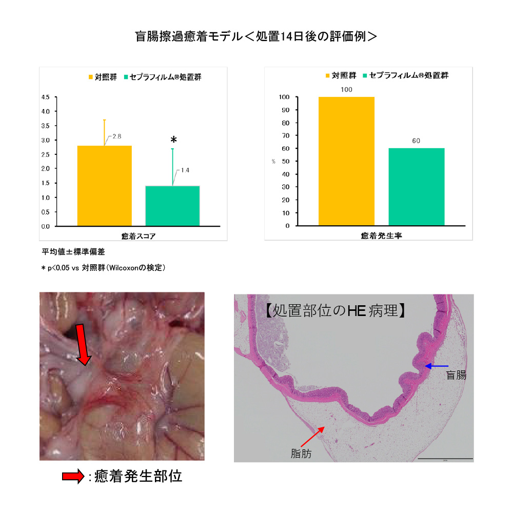 外科手術を受けた際に、侵襲を受けた臓器と周辺組織が接触する事で組織同士が癒着してしまう事があります。例えば消化器官の手術後に発生する臓器癒着は腸閉塞や腹痛を伴うこともあり、手術後のQOL低下を招きます。このような癒着の発生を防止する為に癒着防止材と呼ばれる医療機器が製品化されています。癒着防止材の多くはフィルム形状で患部へ貼り付ける製品ですが、腹腔鏡手術に適したスプレータイプの製品も存在します。形状は異なりますが全ての癒着防止材に共通しているのは生体吸収性材料で構成されている点で、適用部位の治癒が完了した後は速やかに消失する必要があります。このような治癒過程を考慮すると、非臨床試験で癒着防止材の有効性を評価するにはin vitroではなく、外科処置による癒着の発生、評価物質の消失を評価できるモデル動物が必要不可欠です。日精バイリス株式会社では腸管や肝臓を中心に様々な癒着モデルを構築し、これまでに100試験以上の有効性評価試験を実施しています。